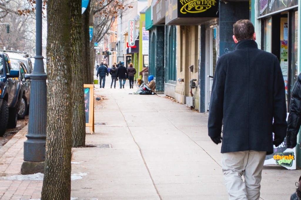 As I approached the door, my eyes met those of a man sitting on a bench near the store’s entrance. He was dressed in brown, shabby, dirty clothes, ripped and ragged. His face was weathered and worn. A wiry grey beard, which pierced through deep wrinkles, was braided to a thin point and, stiffened by the cold, jutted out at a strange angle from his chin. His russet and wrinkled hands, wrapped in red fingerless gloves, clung to a jar he held out. “Can you help me, Ma’am?”